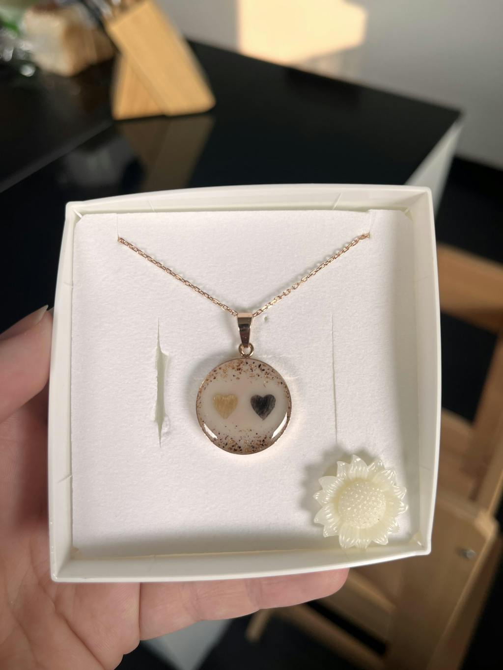 Eine individuelle Halskette aus 925 Silber – optional befüllt mit Haarsträhnen, Fell, Blumen, Muttermilch u. v. m. Für Fassungen ohne Muttermilch empfehlen wir einen weißen oder weiß-metallic Hintergrund. Hypoallergen, nickelfrei & ein liebevoll handgefertigtes Unikat ♥
