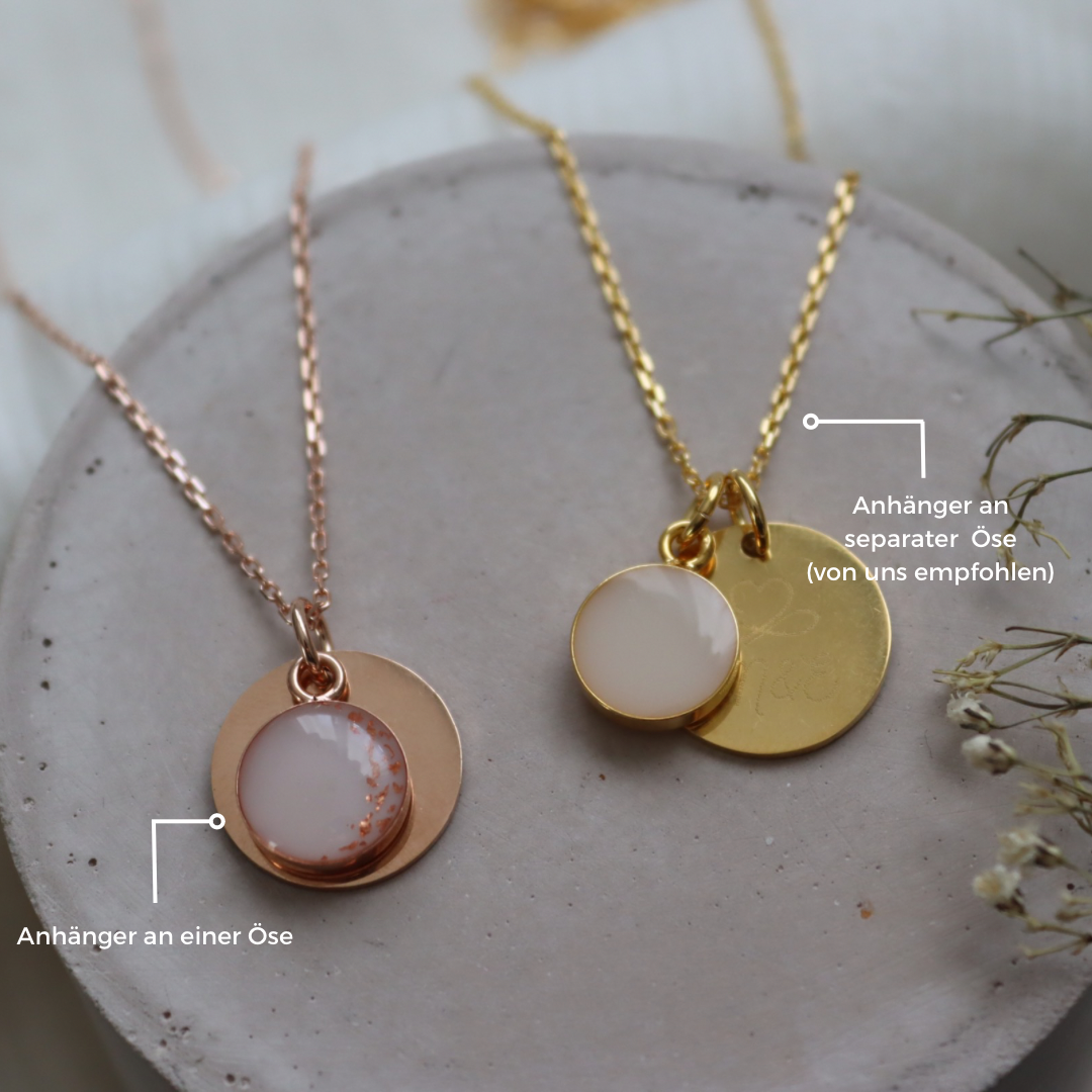 Hinweis: Die Fassung liegt dauerhaft auf dem Gravurplättchen auf und kann mit der Zeit Kratzer verursachen & dafür sorgen dass sich die Vergoldung schneller abträgt. Hier empfehlen wir die dickere Kette, damit das Plättchen etwas versetzt angebracht wird.