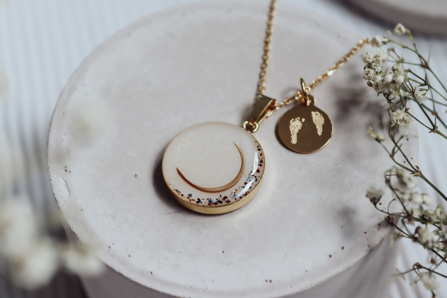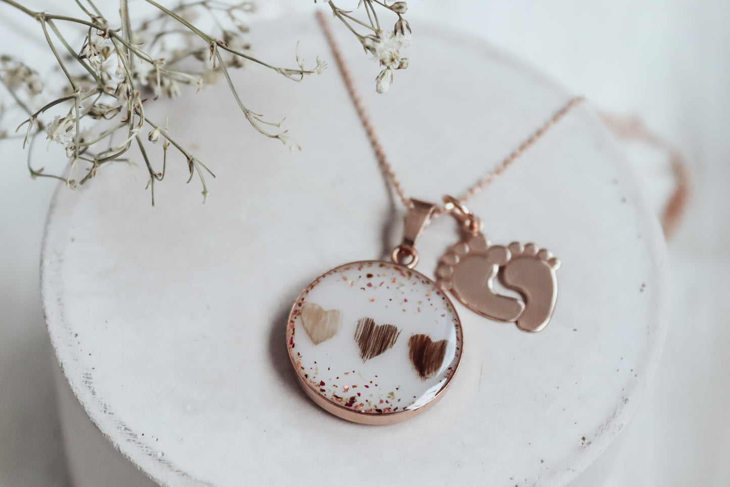 Schmuck mit Muttermilch braucht aufgrund der Konservierung der Milch etwas länger. Hier beträgt die Lieferzeit je nach Design ca. 9-13 Wochen nach Erhalt der Materialien.