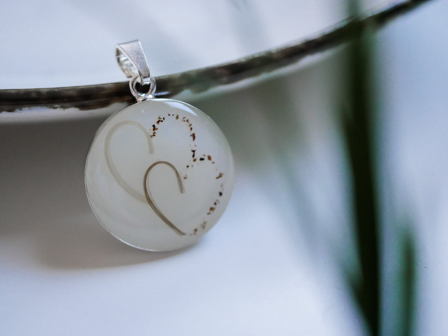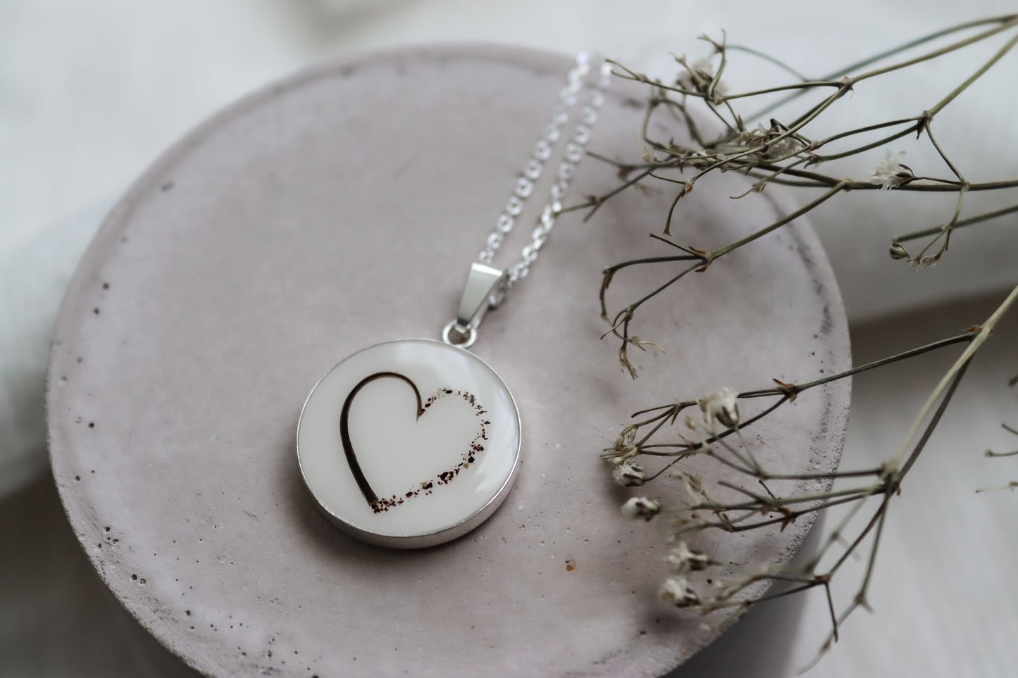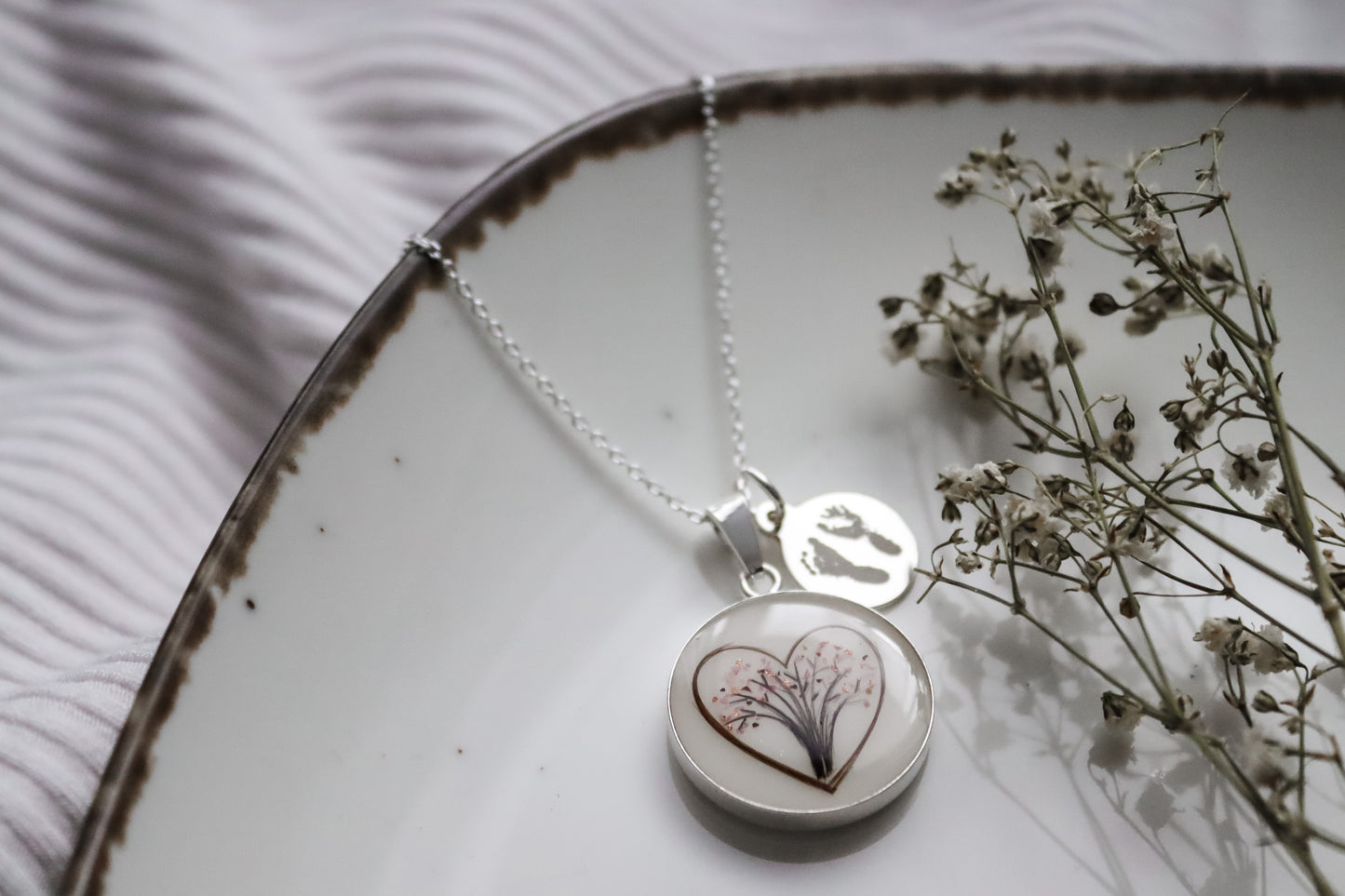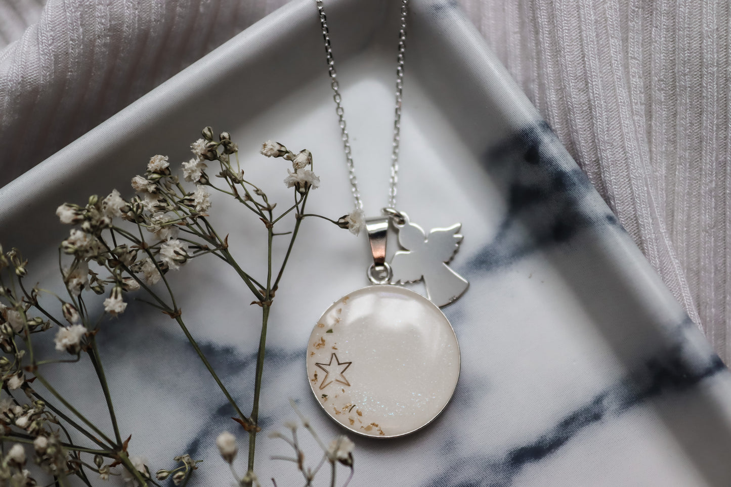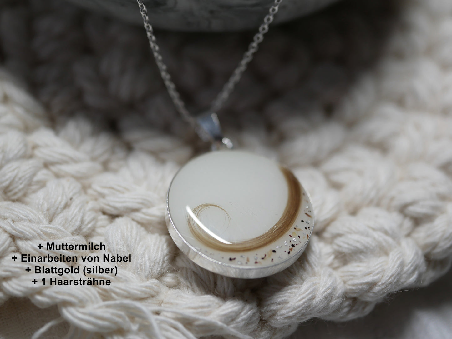 Eine individuelle Halskette aus 925 Silber – optional befüllt mit Haarsträhnen, Fell, Blumen, Muttermilch u. v. m. Für Fassungen ohne Muttermilch empfehlen wir einen weißen oder weiß-metallic Hintergrund. Hypoallergen, nickelfrei & ein liebevoll handgefertigtes Unikat ♥