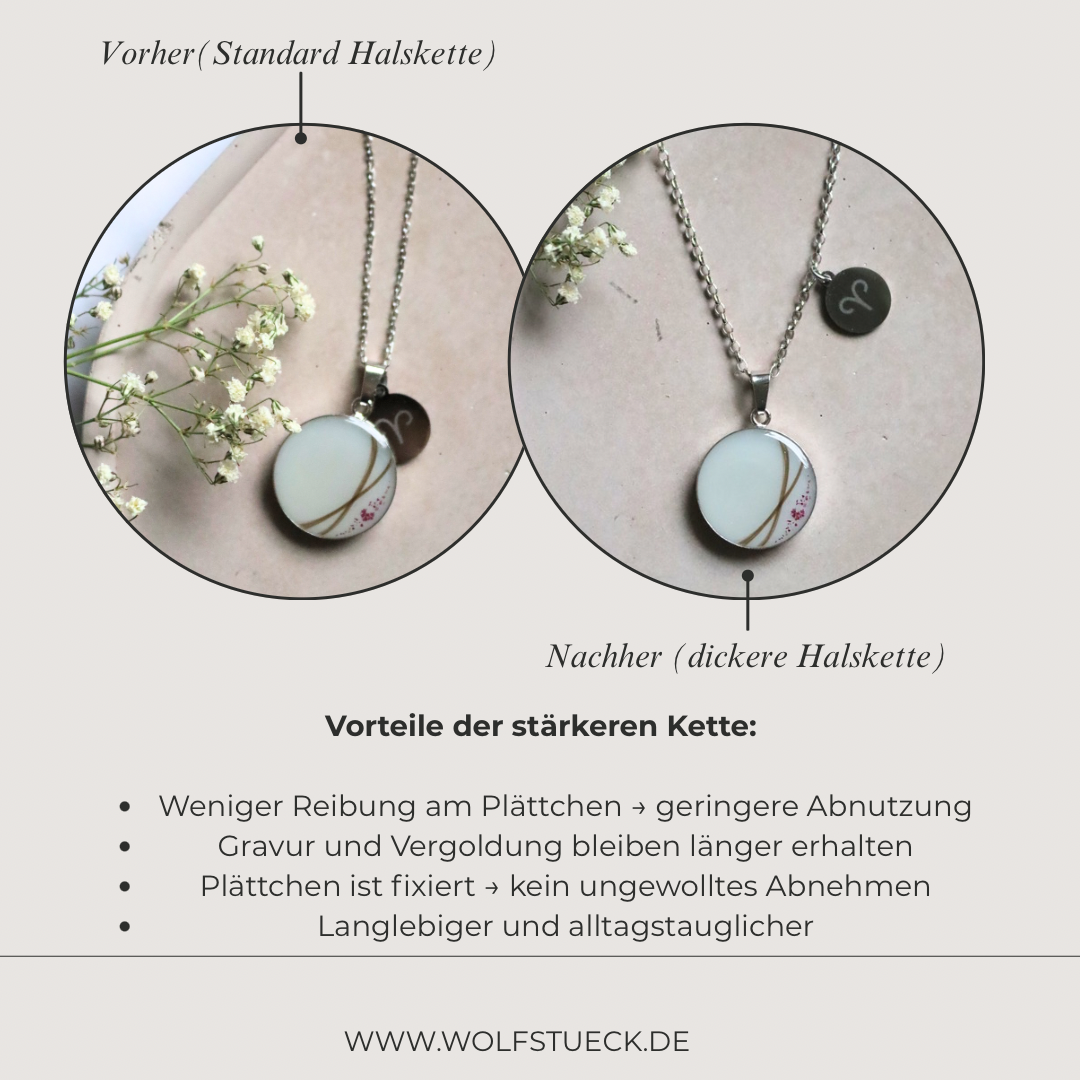 Diese Vergoldung kann sich - je nach Trageverhalten - bereits nach kurzer Zeit abreiben. Besonders bei Ringen, aber auch bei Plättchen mit zusätzlichem Anhänger, entsteht durch alltägliche Reibung eine natürliche Abnutzung. Die Oberfläche wird dabei nach und nach heller und der Silberton des Grundmaterials tritt zum Vorschein.