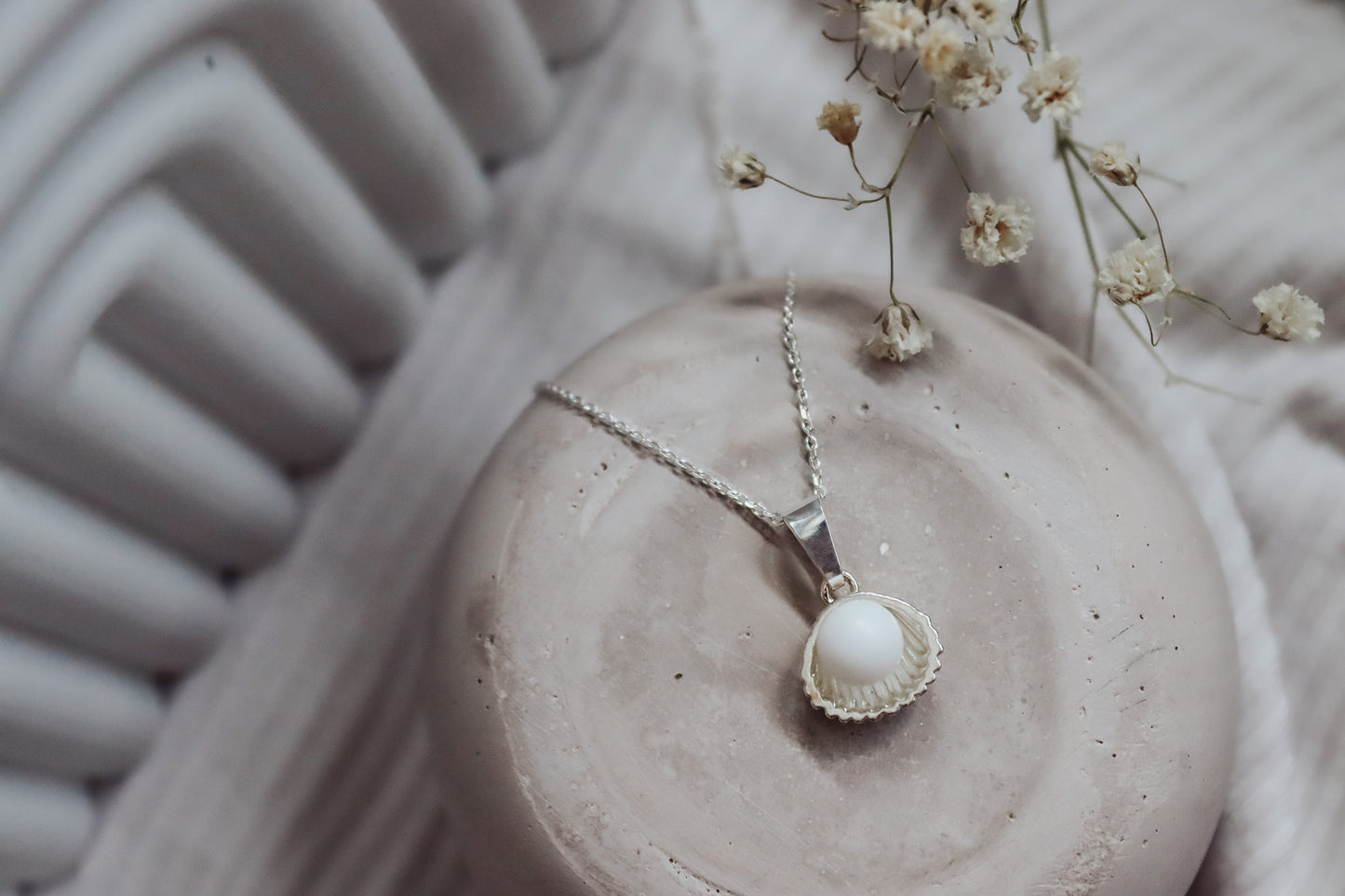 Eine wunderschöne Halskette in Muschelform mit eingearbeitetem Muttermilch- oder Aschesteinchen – ein ganz besonderes Erinnerungsstück. Gefertigt aus 925 Silber, hypoallergen, nickelfrei & einzigartig ♥
