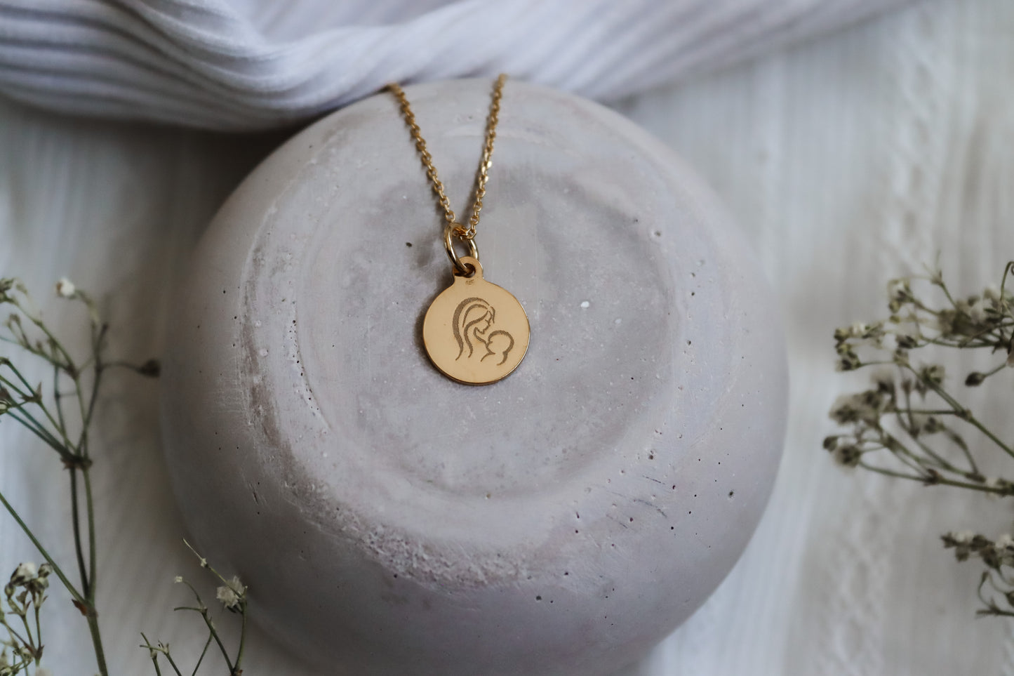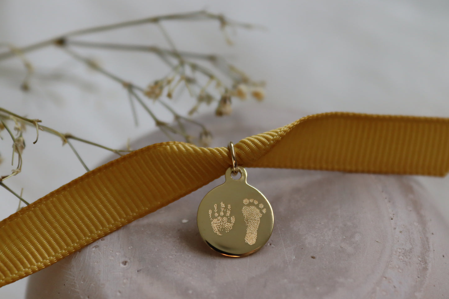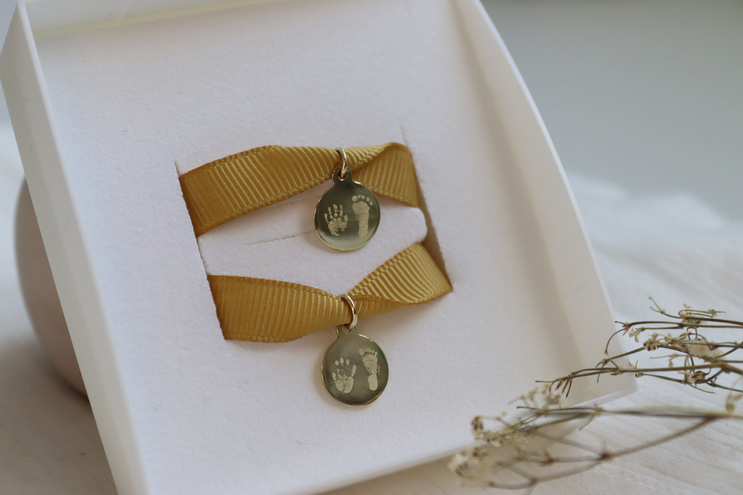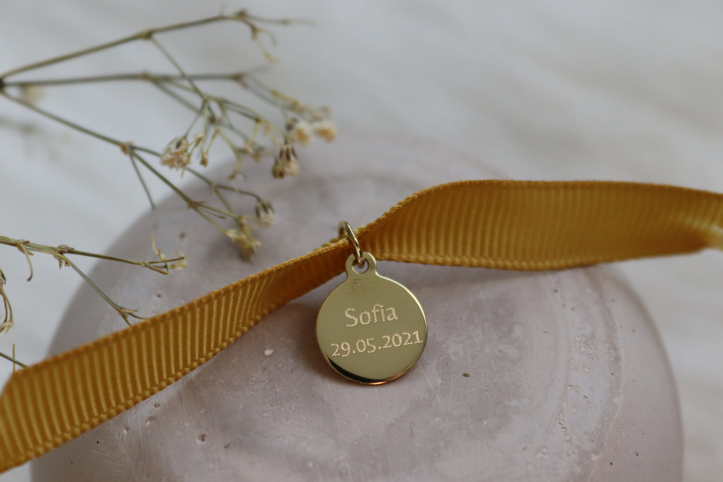 Ein zartes Plättchen aus recyceltem Echtgold (12 × 12 mm, Stärke 0,8 mm) – inkl. Standardgravur auf der Vorderseite (Namen, Daten, Buchstaben etc.). Optional ist eine Premium-Gravur möglich, z. B. Abdrücke, kleine Zeichnungen oder Unterschriften. Lieferung ohne Halskette.