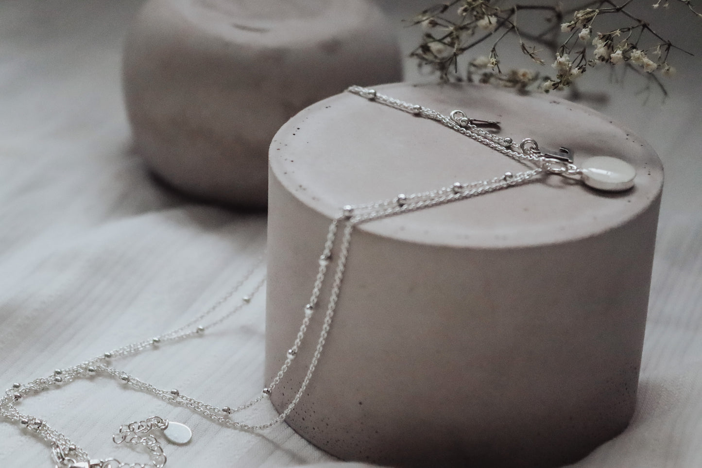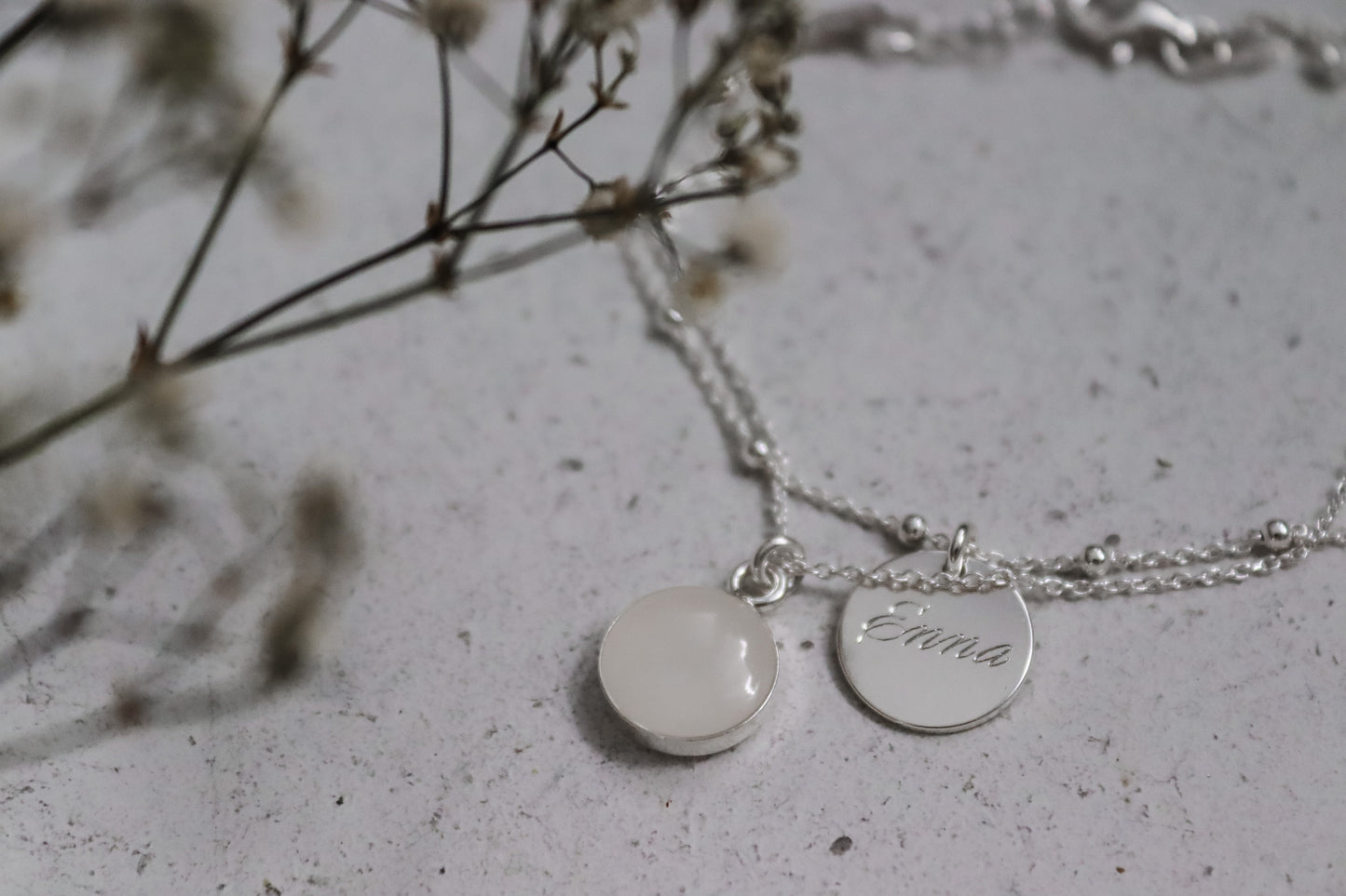 Schmuck mit Muttermilch braucht aufgrund der Konservierung der Milch etwas länger. Hier beträgt die Lieferzeit je nach Design ca. 9-13 Wochen nach Erhalt der Materialien.